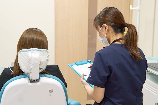 ご来院いただいたら、まず受付をお済ませください。その後、現在のお口の状態や気になる症状について、問診票にご記入いただきます。